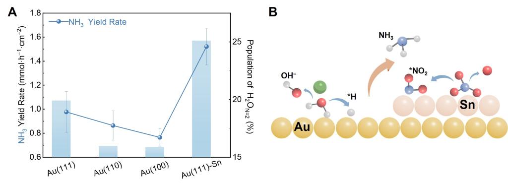 图2. Au(hkl)和Au(111)-Sn界面的NO3RR性能。(A)−1.6 V下1:11 Au(111)、Au(110)、Au(100)和Au(111)-Sn/LiNO3界面的NH3生成速率及H2ON=2含量。(B)Au(111)-Sn界面NO3RR过程示意图。