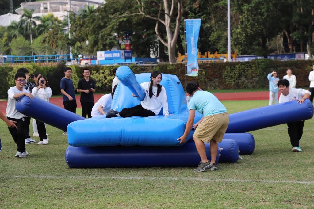 该项目要求队员们共同操控大型“毛毛虫”道具在跑道上快速行进。面对道具操控的难度,大家前后呼应、迎难而上,在欢声笑语中带领象征团结的“毛毛虫”奋勇向前,成功冲过终点。
