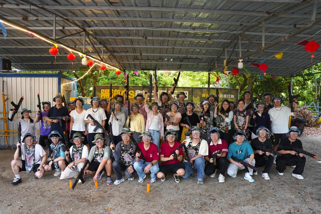 第二站到达巽寮湾CS水晶弹野战基地。巷战与丛林混合的地形立刻激发了师生们的参与热情。大家穿上装备,握紧安全的水晶弹枪,在轮胎墙、迷彩网及各类掩体之间快速跑动、相互掩护、协同进攻。在“枪林弹雨”中,有人呼喊战术,有人警戒侧翼。几轮攻防之后,同学们满头大汗,笑声不断。