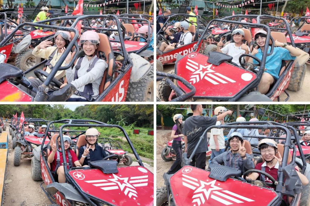 第三站体验双人越野车。在专业教练的现场指导下,师生们驾驶越野车在赛道上疾驰:弯道转向、陡坡冲刺、起伏路段的平稳穿梭。短短半小时里,引擎轰鸣与海风交织,紧张而刺激。大家在多次翻越障碍的过程中锻炼了胆量,双人配合控车的过程也不断加深了彼此的默契。
